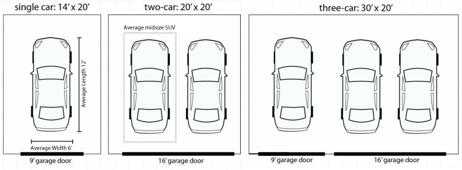 Will your garage only be used for vehicles, or do you need more storage space? Maybe you want to build a workshop, man cave or additional living space? One of the biggest factors that will determine how big of a garage you build, will be how much space you have. The minimum space you wil need for a one car garage will be about 14'x20', two car garage will need 20'x20' or three car garage a minimum of 30'x20'.
